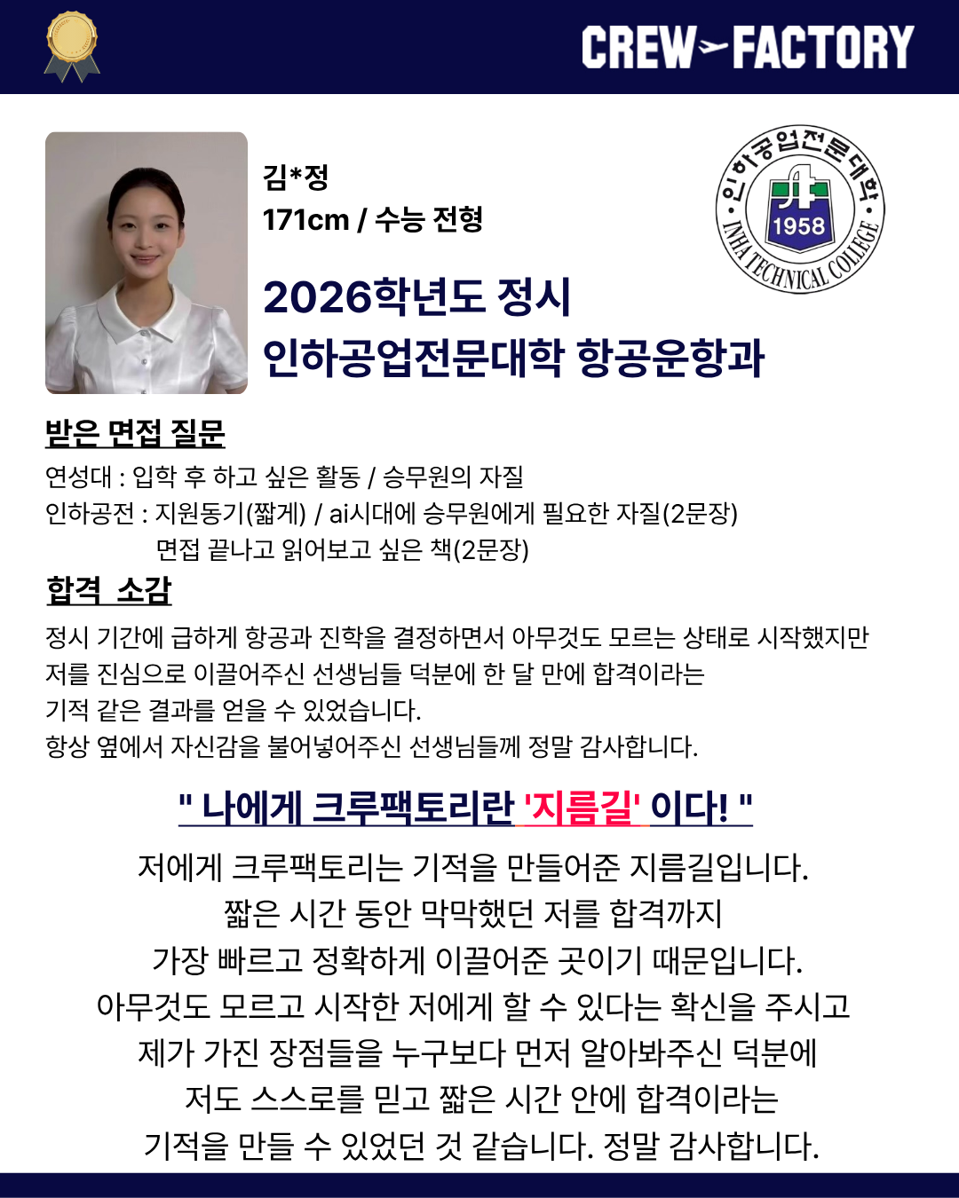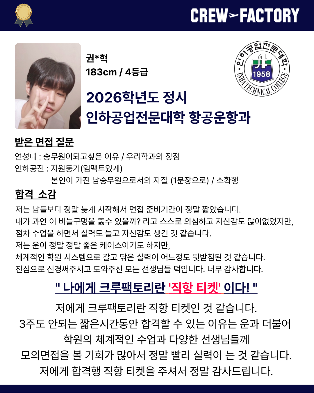 • 인하공업전문대학 항공운항과 출신으로 승무원 특성을 정확히 반영한 면접 관리