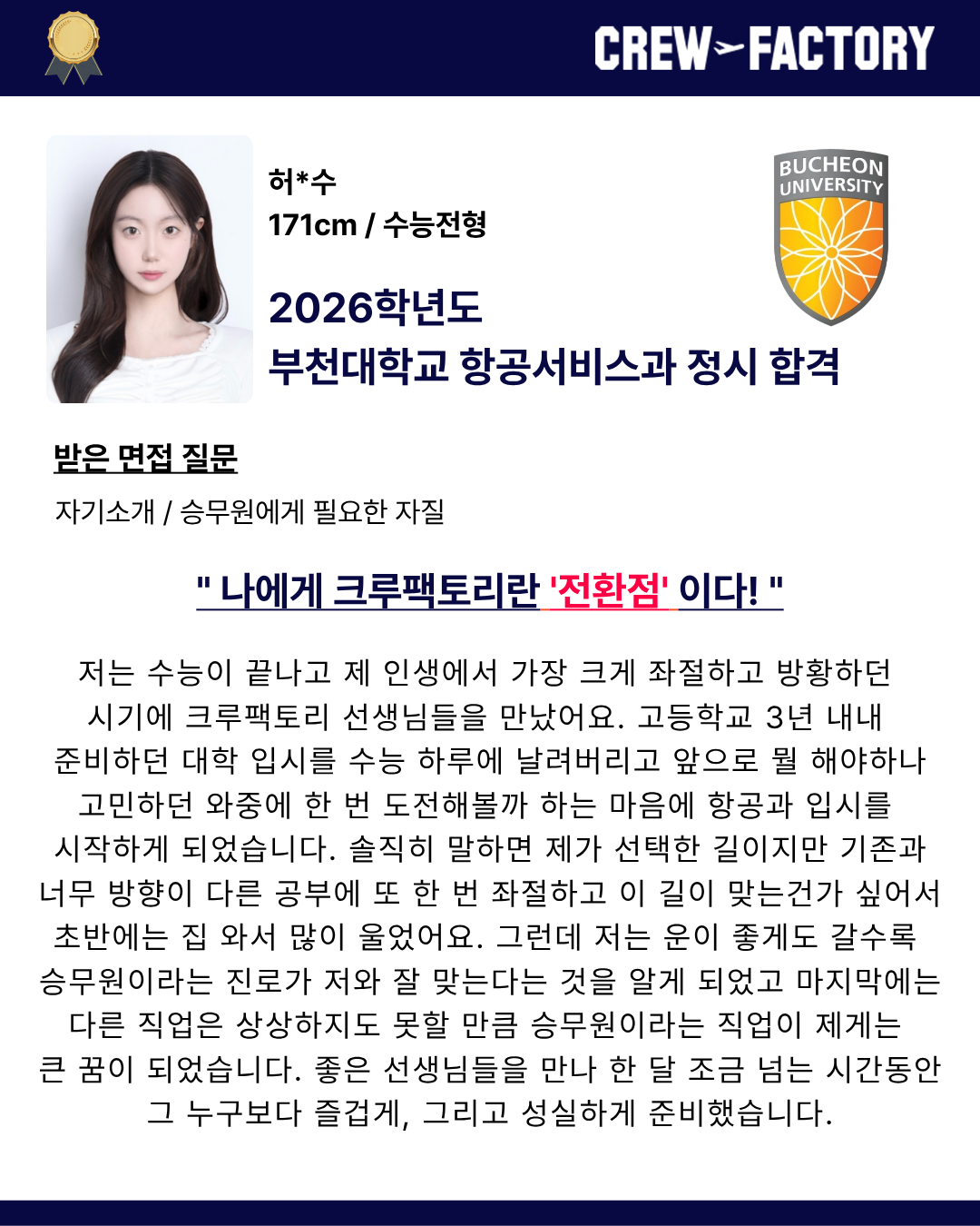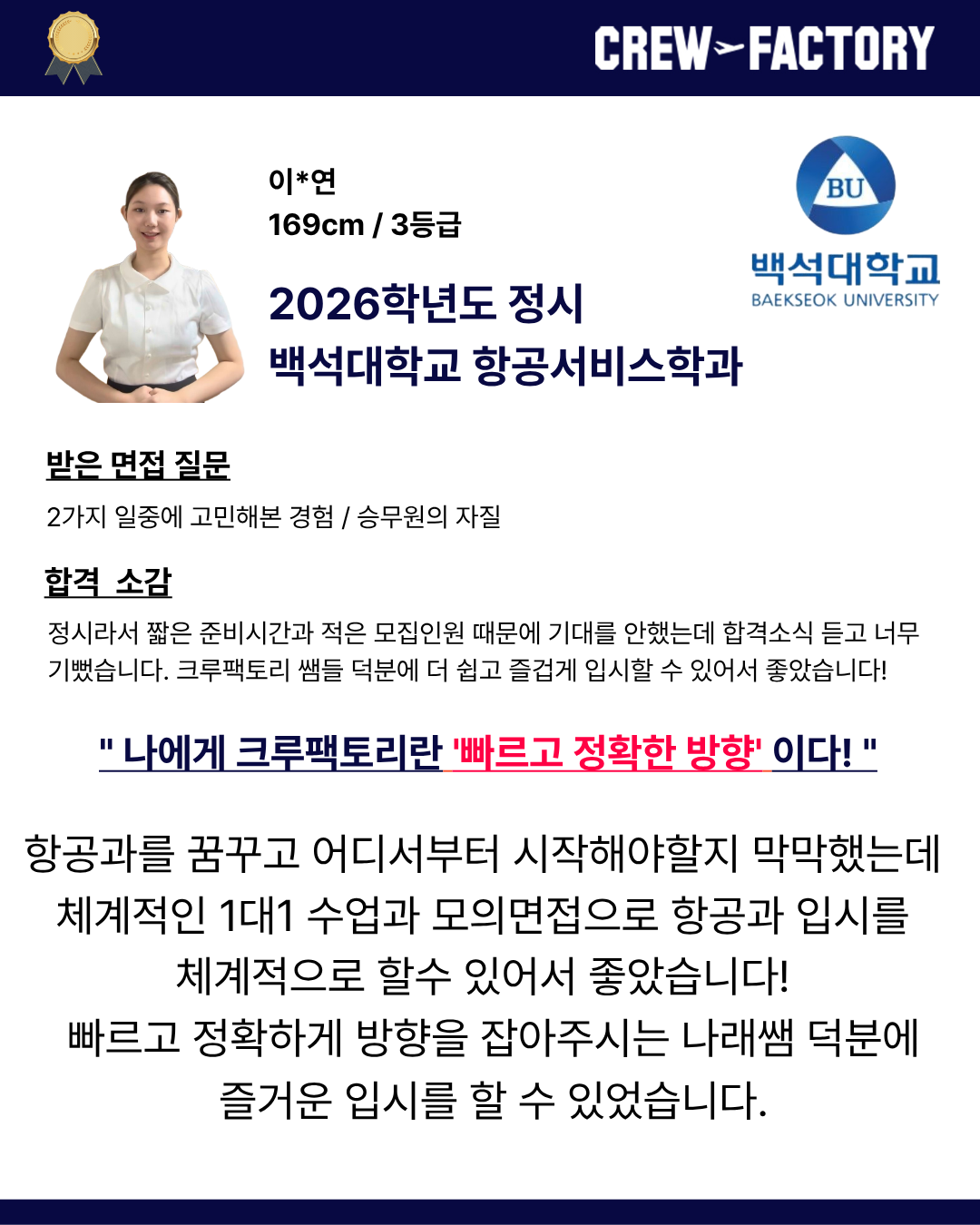 그동안 승무원이라는 직업에 자세히 알아보지도 않았고 여러 면에서 부족했던 저에게 단호하게 피드백 해주시고 희망을 주신 덕분에 많은 도움이 되었던 상담 이였습니당!?친절하게 자세히 설명해주신 크루팩토리 선생님께